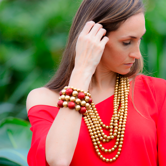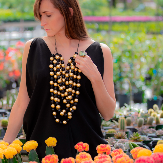 At the heart of the collection are the stunning necklaces, featuring five strands of intricately painted wooden beads in shimmering gold. The iconic "Dorado Necklace" boasts five strands of medium-sized golden beads, exuding elegance and sophistication. Another standout piece is the "Coamo Necklace," adorned with a magnificent horn as its focal element, adding a touch of exotic allure.