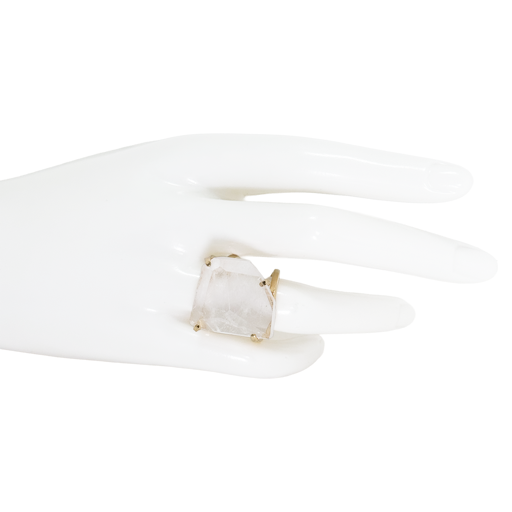 The Facetted Arc Ring is a tribute to light and raw beauty. Featuring a unique, irregular faceted gemstone – about one inch long – each stone is set in a bold arc of flat, 18kt gold-plated metal that frames it without a backing, allowing its natural translucency to shine through. Choose between Amethyst, for calm, protection, and balance; Crystal Quartz, for clarity, focus, and amplified energy; or Aventurine, for growth, luck, and renewal. Handcrafted with intention, this ring lets the stone float freely, a luminous reminder of strength and grace. We use natural gemstones, so each piece may vary slightly in shape, size, and color, making every ring one-of-a-kind.