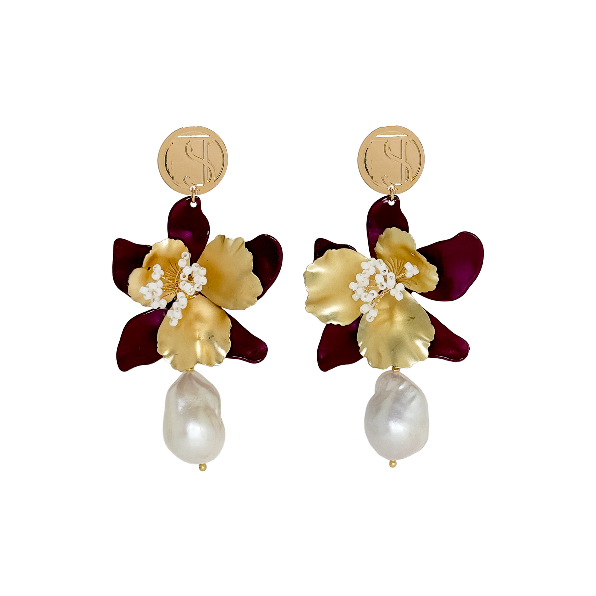 Inspired by nature’s delicate transformations, the Pearl Flower Bloom Earrings blend floral elegance with organic beauty. Each earring features a layered bloom: at the base, a five-petal flower crafted in soft enamel – available in beige, burgundy, or muted orange – is accented by sculpted brass petals and luminous glass beads that catch the light with every movement. From the heart of the flower, a 13-15mm baroque pearl dangles gracefully, adding depth and timeless charm. Hanging from a signature 18kt gold-plated stud engraved with our logo, these earrings measure 3 inches in length. We use natural baroque pearls, so each pair may vary slightly in shape, size, and color – no two blooms are ever the same.